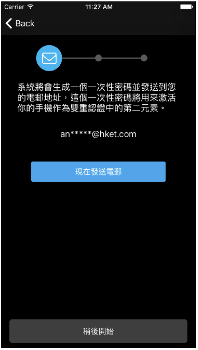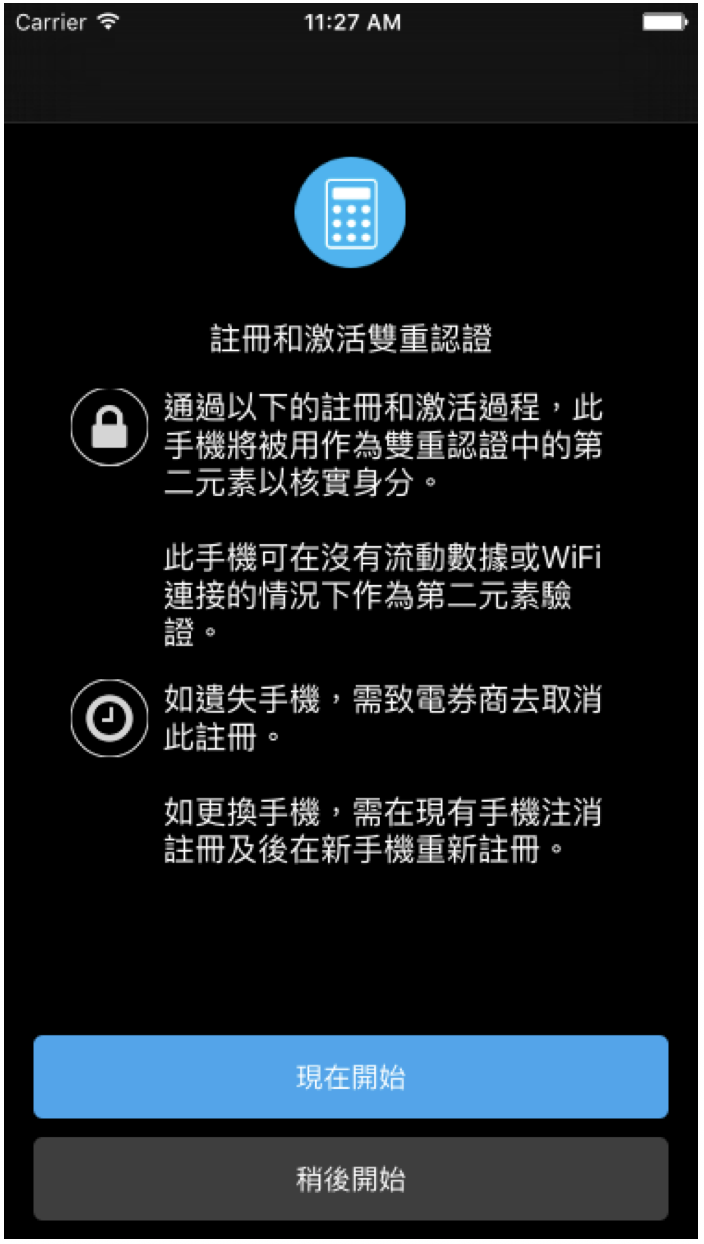 步骤3. 交易速手机App显示「现在开始」来注册和激活双重认证