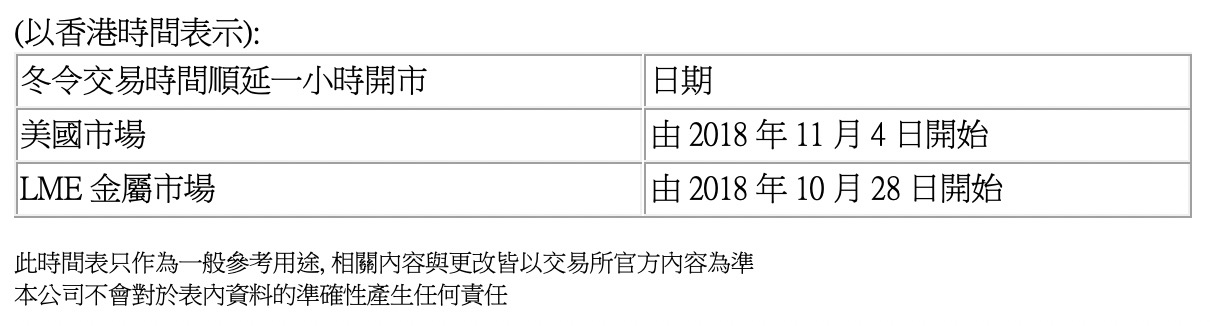 2018年冬季环球证券及期货交易时间将有特别安排,简列如下表: