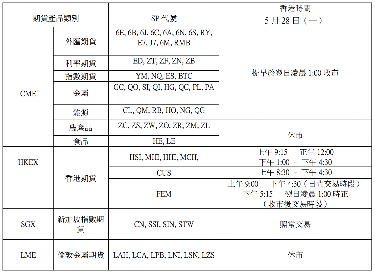茲因美國陣亡將士紀念日及春季銀行假期關係,故本公司之香港及環球期貨交易時間將有以下安排: